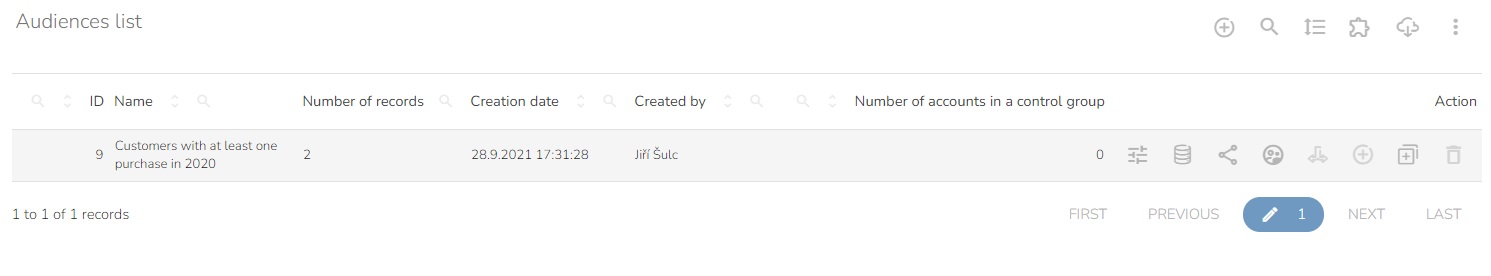 In the top-right menu, you have various options — Create a new audience, search in the table, how many rows you want to display, filter out the specific columns, or export the whole content. You can also set there the font size and resolution of the table.